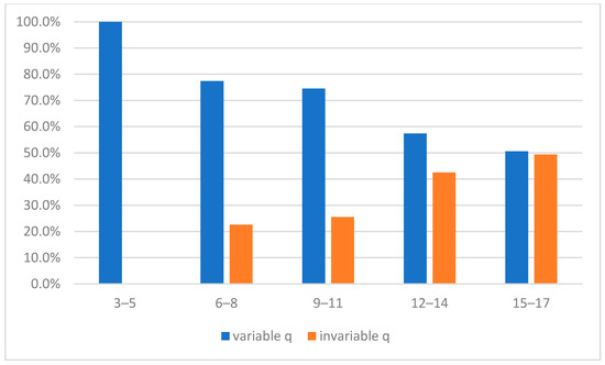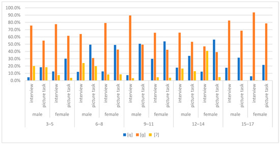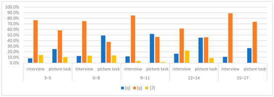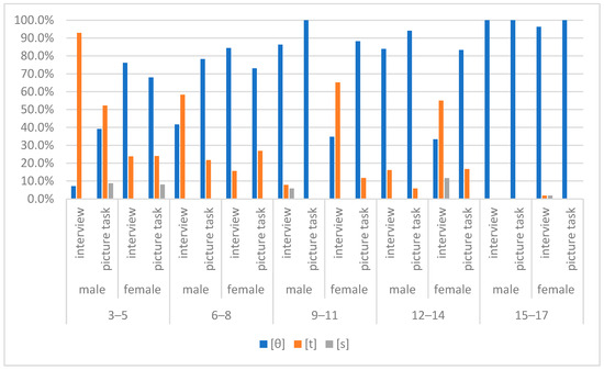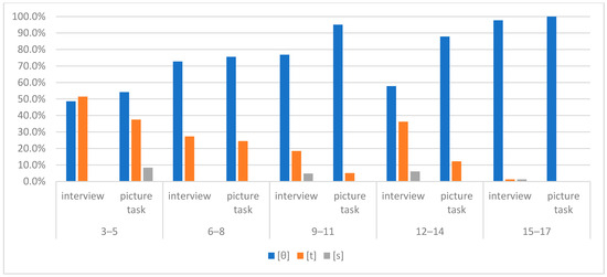 Greater use of [θ] in the picture task appeared in the speech of all groups. Little difference was recorded in the speech of the 15–17-year-old group, who used the variant categorically in the picture task and near-categorically in the interview context. The most notable differences appeared in the speech of 3–5, 9–11, and 12–14-year-old speakers, as Table 3 and Figure 2 below illustrate. These differences were significant for 3–5-year-old speakers, whereby use of the standard variant [θ] was significantly higher in the picture task at p = 0.016, while the urban variant [t] was significantly favored in the interview context: p = 0.002. This is especially remarkable considering their young age and presumed inexperience with SA. Significant differences were also observed in the speech of 12–14-year-olds, who utilized the standard variant significantly more in the picture task at p = 0.048, while they used the urban variant [t] significantly more in the interview context: p = 0.030. The greater use of the latter during the interview by 12–14-year-old speakers was mainly due to the preference for urban variants by female speakers in the group, as will become evident in Section 6.1.3, Section 6.2.3 and Section 6.3.3 (see Shetewi 2018, 2023 for further details).