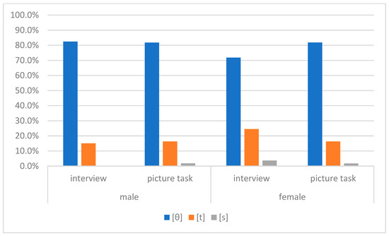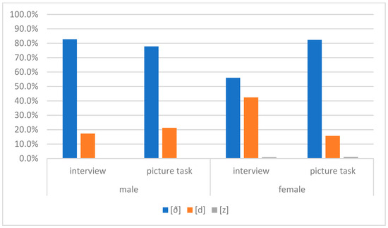 Both male and female speakers used [θ] more in the picture task than in the interview context, as is evident in Table 4 and Figure 3 below. Differences were significant in the speech of male speakers, who used the standard variant significantly more in the picture task (M = 81.58, SD = 28.77) than in the interview context (M = 65.56, SD = 41.67) at p = 0.008. Their use of the urban variant [t] was significantly less frequent in the same context: p = 0.006. For female speakers, differences in using the standard variant in the picture task (M = 78.64, SD = 30.71) and the interview context (M = 64.68, SD = 33.80) were not significant at p = 0.059. However, their preference for the urban variant was significantly less in the picture task at p = 0.045. It is also worth noting that while female speakers used [θ] noticeably less than their male peers during interviews, this difference disappeared in the picture-naming task, suggesting style-shifting among female speakers in more formal contexts. This outcome also indicates that males and females are equally adept at shifting across a range of styles including SA when the context requires it.