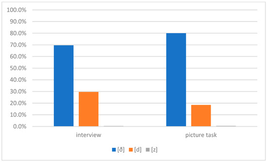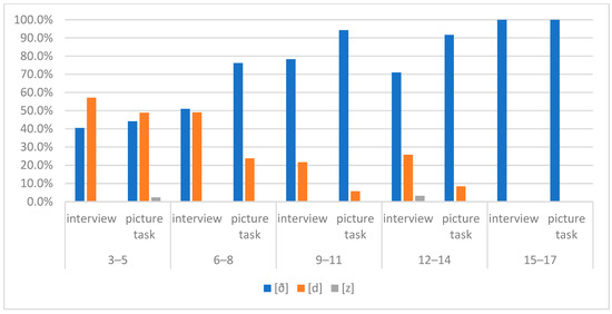 The most noticeable stylistic variation in the realization of the variable occurred in the speech of 6–8, 9–11, and 12–14-year-old speakers, as shown in Table 7 and Figure 6 below. However, significant differences only appeared in the speech of 9–11-year-olds, whose use of [ð] was significantly higher in the picture task than in the interview context at p = 0.032.