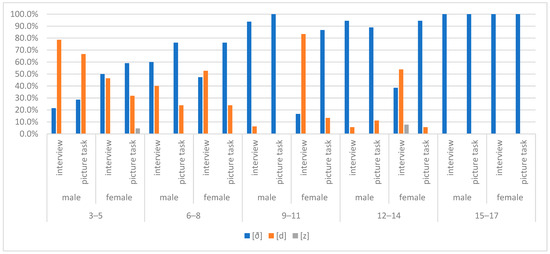 Table 9 and Figure 8 below show that the use of [ð] was greater in the picture-naming task than in the interview context for most speakers. Noticeable differences appeared in the speech of male and female speakers in the 6–8-year-old group, as well as among female speakers in the 9–11 and 12–14-year-old cohorts. For example, use of the variant rose from 38.5% in the interview context to 94.4% in the picture task amongst 12–14-year-old girls. Participants in the 15–17-year-old group used the variant categorically in both contexts, so that no variation in the realization of the variable could be observed in their speech production.