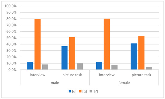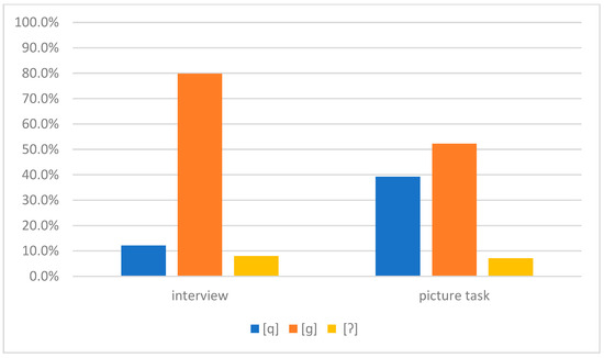 As hypothesized, use of the standard variant [q] was substantially greater in the picture task than in the interview context. It should be noted that none of these instances were due to lexical conditioning, as the items chosen for (q) in the picture task would all have [g] realizations in the local dialect. A paired-samples t test revealed the difference in frequency to be highly significant at p < 0.001. In turn, the local variant was used significantly less in the picture task at p < 0.001. Use of the urban variant was significantly less in the picture task as well, at p = 0.022. Despite the considerable increase in using the standard variant in the latter, the local variant was still the most frequent, as can be seen from Table 10 and Figure 9 below.