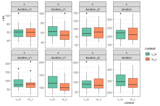 Durational differences (in ms) of initial vowel, target consonant, subsequent vowel, and total V_CV and VC_V sequences.