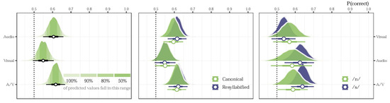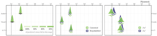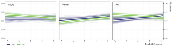 As opposed to the audio condition, the role of proficiency slightly helped in audiovisual processing (β = 0.02, HDI = [−0.08, 0.12], ROPE = 95.89, MPE = 0.64). As seen in Figure 4, this is true for /n/ but not for /s/, where an increase in proficiency actually decreased the likelihood of selecting the correct consonant. Overall, language proficiency does not show an effect on the processing of canonical versus resyllabified utterances for the L2 learners. Figure A1 and Figure A2 in Appendix A provide a broader overview, including the proficiency distribution across all conditions.