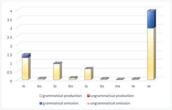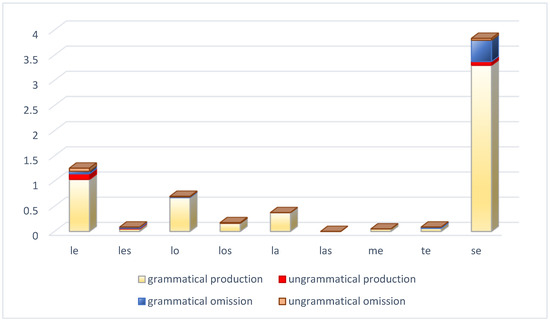 The figure presents weighted data rather than raw figures. Specifically, we calculated the frequency of clitics relative to the total number of words. For instance, an occurrence rate of 1.26 for le indicates that 1.26% of the total words were the clitic le. Raw data can be found in Appendix A.
