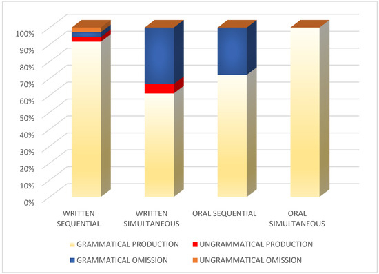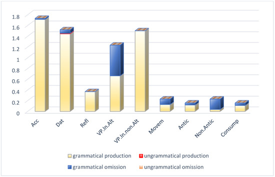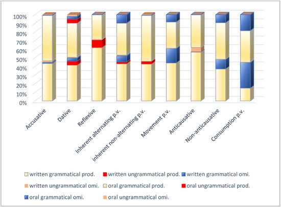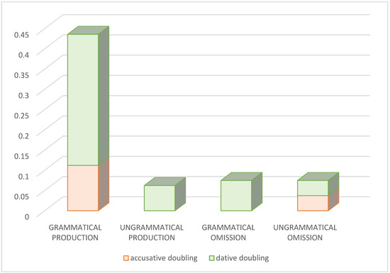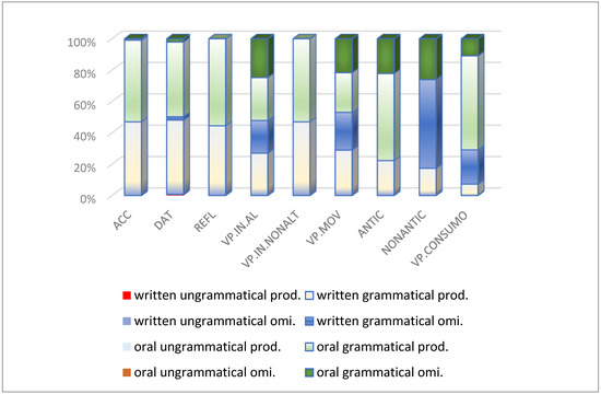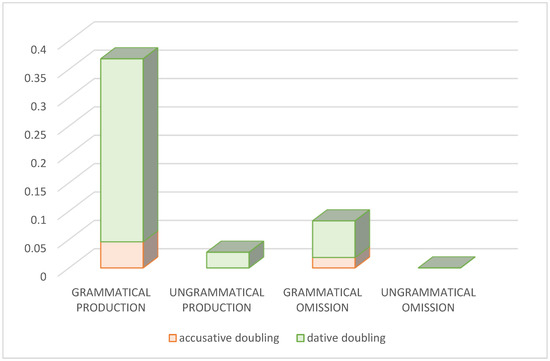 In our codification, third-person dative included cases of so-called spurious se, which refers to the replacement of le for se in sentences like Se lo doy (I give it to her) in contrast with the ungrammatical *Le lo doy (I give it to her). No cases of the le and lo combination were found in the data.