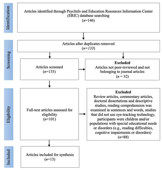 Reviews, commentaries, and doctoral theses were not included in this review. Descriptive studies that reported gains in reading comprehension as an additional benefit of implementing eye tracking technology, but did not have reading comprehension as a goal of text processing, nor did they report measurable outcomes on reading comprehension tasks, were also excluded. After eliminating duplicate studies, the authors independently applied the inclusion and exclusion criteria. Finally, 13 articles were included in this review.