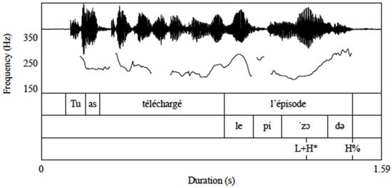 First, Figure 2 illustrates the low rising contour L+H* H% for the question Tu as téléchargé l’épisode? ‘Have you downloaded the episode?’. The final word of the sentence épisode ‘episode’ is characterized by an initial peak on the first syllable, which could correspond to the optional initial accent Hi, a subsequent fall, and a rise on the final stressed syllable <so> in épisode ‘episode’. The rise on this syllable stems from a lower tone at the onset of the stressed syllable (L+H*) and culminates in a high (H%) boundary tone.