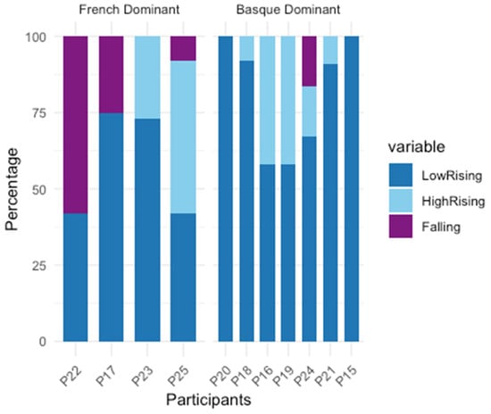 With the exception of participant 22, all participants showed a preference for rising contours (attested in ≥75% vs. 42% for participant 22). Participant 25 exhibited a slightly higher preference for high rising contours, while the rest of the participants produced more low rising contours. Falling contours were produced by three out of four participants in the French-dominant group, although they were more common in participants 22’s productions.