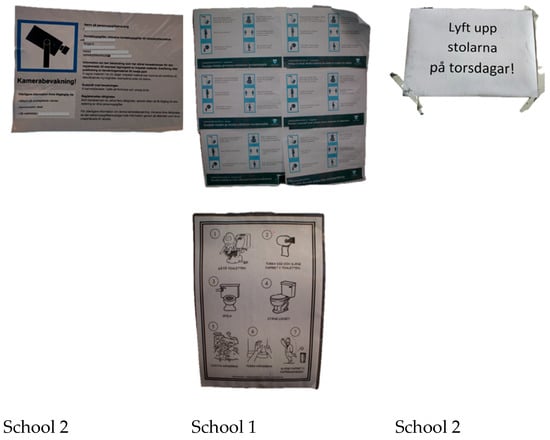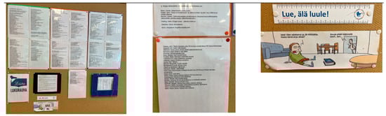 After removing duplicates and blurry photos, we had 439 photographs left: 52 from School 1 and 387 from School 2. The number of photographs from School 2 was reduced to 177 photos because there were several photos of the same phenomenon, such as a notice board and the separate documents on it (e.g., Figure 1).