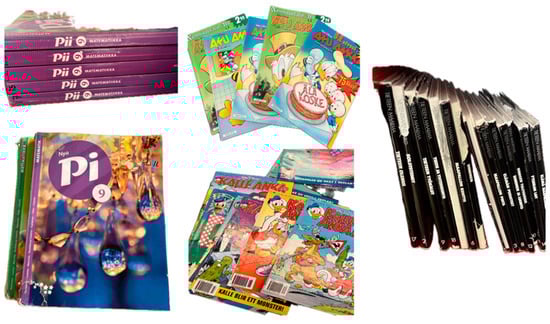 Maths textbooks, Donald Duck magazines, and popular science books in Finnish and Swedish (School 2, copyright Essi Hentilä).