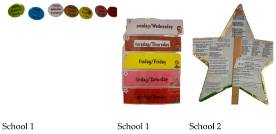 The teacher-made bi- or trilingual signs shown in Figure 3 characterise the schoolscape in School 1 and their content is probably connected with the pupils’ age (primary school). Because English and Swedish are the only mandatory languages in School 1, where the Swedish curriculum applies, these two languages are understandable. Interestingly, the Finnish language is also present (on weekdays in column 1 in Figure 3), whereas Sámi languages are consistently excluded. Teachers in School 1 probably use the weekdays as a teaching aid or as a reminder for pupils to use when needed. One disadvantage was that signs were small and impossible to read from a distance. Moreover, the colours used in the signs were similar, even though the languages varied.