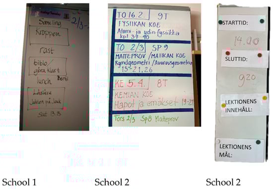Information concerning the lessons’ content, aim, and start and end times was given purely in Swedish in both schools (column 1 and 3 in Figure 4). When it comes to tests in School 2, teachers can give information in both Finnish and Swedish (middle photo; Figure 4), such as the information about the maths test on the geometry of spaces (MATTEPROV Rymdgeometri/MATIKAN KOE Avaruusgeometria). This kind of information was handwritten by teachers.