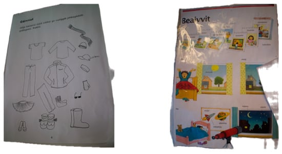 Furthermore, in School 2, we found notes left on a whiteboard from a lesson written only in Swedish and bilingual Finnish–Swedish. Handwritten information in Finnish and Swedish also existed in various folders. This may be extra teaching material, such as instruction on conducting a film analysis. Again, this kind of material appeared especially frequently in School 2, where pupils were teenagers and the classrooms were subject-related, compared to School 1, which had young pupils and grade-specific classrooms. However, in School 1, the North Sámi language appeared twice in a teaching and learning function, being discovered on a worksheet about suitable clothes and a sheet with a multimodal presentation about words related to a day (Figure 5).
