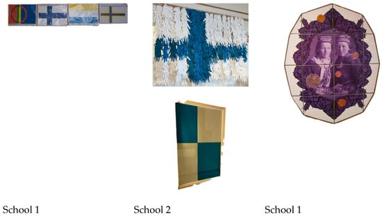 In contrast, the upper photo in the second column of Figure 7 represents Finland’s national flag, which consists of white and blue palms, which, in turn, may belong to pupils in School 2. Blue and white colours in School 2 are also used on informative and navigational signs, such as one on the door to the classroom where Finnish language is taught or the school’s logo, which contains three colours (white, blue, and yellow) that reflect the colours of the Finnish and Swedish flags (cf. ).