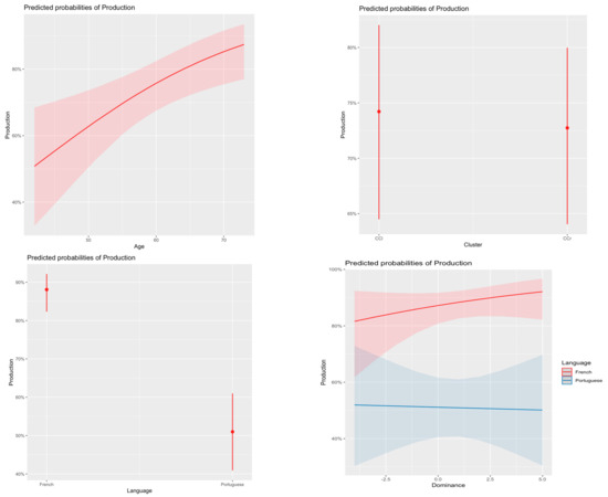 Figure 1 illustrates that the increase in age favors the correct production of branching onsets. Children below 58 months (4 years and ten months) are unlikely to master branching onsets. The type of cluster does not seem to impact the correct production of branching onsets: there is a great variability around cluster production that is not explained by the quality of the segments. On the contrary, language strongly impacts the production of branching onsets: children are better in French than in Portuguese. Finally, while dominance as a fixed effect has no influence on the production of branching onsets, our model suggests that the interaction between dominance and language impacts the correct repetition of branching onsets. Specifically, the children dominant in French (closer to a value of 5) tend to perform better in French than in Portuguese. Among all the effects found, this one is the least robust (p = 0.03586).