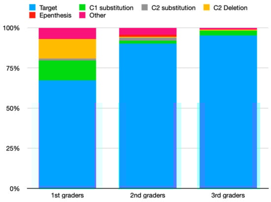 Most of the children, independently of their grade, produced Cl clusters more than 80% of the time, thus suggesting acquisition of this structure. C2 deletion occurred predominantly in the younger group. C1 substitution was the most common repair for children in the second grade, and C2 substitution was the most common repair for children in the third grade, thus suggesting that, by this time, children have mastered the prosodic structure of branching onsets but are still struggling with their segmental properties. C1 substitution include voicing errors and C2 substitutions include the production of another lateral (absent from the phonetic inventory of the target language; ex: [ɬ] or [ʟ]), a rhotic, a glide, or a vowel, as illustrated in (2).