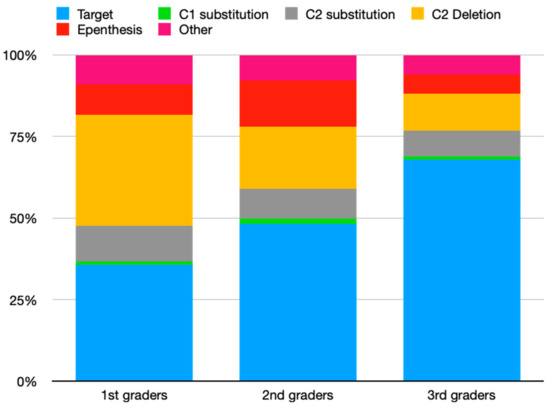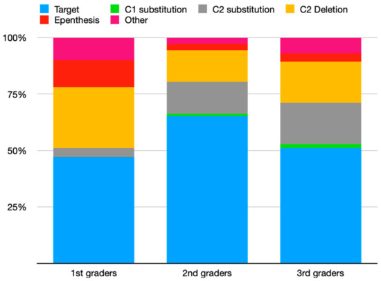 Figure 4 highlights that epenthesis also occurred, especially in the younger group, although this repair was almost never attested in French. If we compare the children’s productions for Cl clusters in French and in Portuguese, Cl clusters were generally more successful in French than in Portuguese.