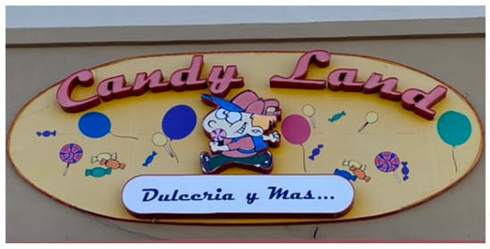 The last coding category was related to linguistics standards, and the codes were “standard”, “code-switching”, “borrowings” and “orthographic errors”. In this category, we focused on the use of code-switching, since the main focus of this study is the contact situation between Spanish and English. Thus, if a sign presented both orthographic errors and code-switching, preference was given to code-switching, and the sign was coded as such. For example, one sign featured the following text, which included both orthographic errors (the lack of a stress mark in “dulcería”/“candy store”) and code-switching (“Candy land. Dulceria y mas”/“Candy land. Candy store and more”) (see Figure 2).