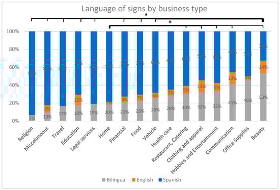Distribution of Spanish, English and bilingual signs across different business types. The asterisk symbol (*) indicates a significant difference.