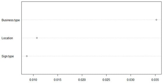 The Random Forest shows that business type is the most important factor in predicting language choice in signs, followed by location and sign type. To determine if all three factors are important in predicting language choice, we conducted a set of binary logistic regression analyses, where the three factors were added one by one to the model, and the AIC and BIC were compared after each addition. AIC and BIC are measures of goodness of fit (of the model to the data), and a lower AIC and BIC indicate a better fit. A difference of two points or more in AIC and BIC between models indicates that they are significantly different. The results showed that all the factors (business type, location, and sign type) contributed to the improvement of the model, which means that they are all important predictors of language choice in signs.