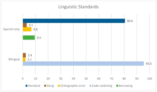 To complete our analysis, we investigated how English is incorporated into an otherwise Spanish discourse (as in the category “linguistic standards”). For the analysis in Figure 9, we only considered Spanish and bilingual signs (n = 1501 tokens).