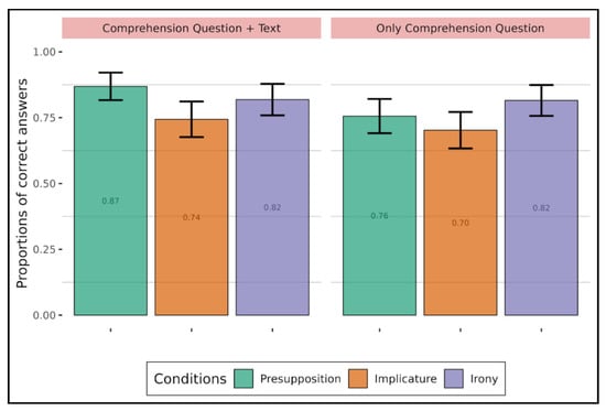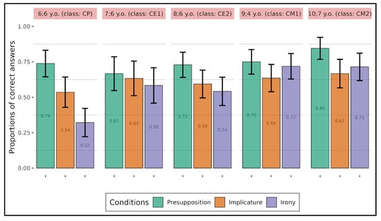 Figure 2 and Figure 3, respectively, show the proportions of correct answers for the children and adults. The color bars correspond to the three conditions: green corresponds to the texts with the presupposition condition, orange corresponds to the text with the implicature condition, and violet corresponds to the texts with the irony condition. The panels in pink in Figure 2 correspond to each class and the panels in pink in Figure 3 correspond to whether the text remained on screen during question answering (left panel) or if there was only the question (right panel). For each figure, 1 means that participants correctly answered the question, and 0 means that their answer to the question was wrong. For example, in Figure 2, children from the first group (mean age: 6.6 y.o.) had a mean accuracy of 0.32 in the irony condition, meaning that they had difficulty correctly answering the question compared to the presupposition condition, where their accuracy is 0.74 (i.e., closer to 1).