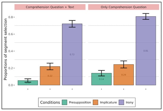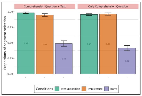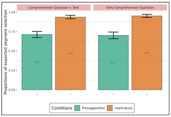 Proportions of expected segment selection depending on presupposition, implicature, and the presence or absence of the display of the text (adults).