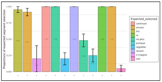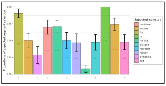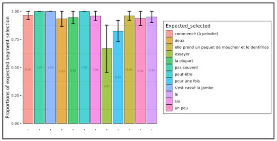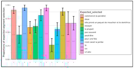 Figure 8 and Figure 9, respectively, present the proportions of the correct selection of the expected word segments by children and adults. “Expected word”, in the case of presuppositions, refers to the presupposition trigger (a lexical element in our examples, such as continue in example (1) above), and in the case of implicatures, we refer to expressions which evoke alternatives, generating a set of other statements which could have been preferred to the one which was pronounced. This is the case, in example (2) above, of the word deux (two), which is involved in a Horn scale () and naturally evokes the stronger alternative three, hence the implicature “not three” and more generally “two and not more”.