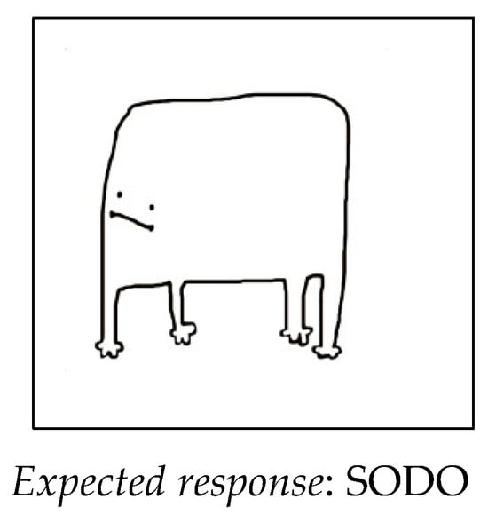 To make the learning sessions more meaningful, the purpose of the experiment was presented as a memory game. Retrieval of the nonce words was tested via a picture naming task. The nonce words were sorted into two blocks and randomized within blocks such that both items from the same category did not appear in consecutive trials (i.e., masculine –e items back-to-back). There were five practice trials using familiar Spanish words. A white image of a nonce object was presented on the computer screen (Figure 4) and participants had 5 s to produce the nonce word (i.e., sees an apple, says “apple”, in this case sees a sodo, says “sodo”). The microphone registered the vocal responses and continued to the next item automatically.