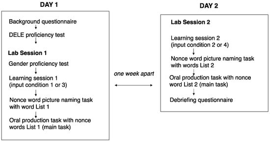 The current study consisted of a background questionnaire and proficiency test (described above), a gender proficiency test with real nouns, two separate learning sessions with nonce nouns, a nonce word picture naming task after each learning session, an oral production task with nonce words after each learning session, and a debriefing questionnaire at the end of the study.