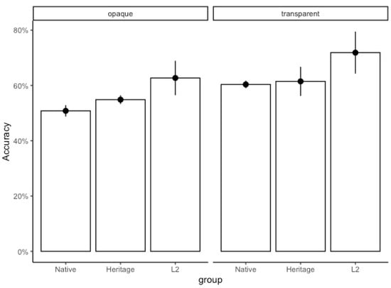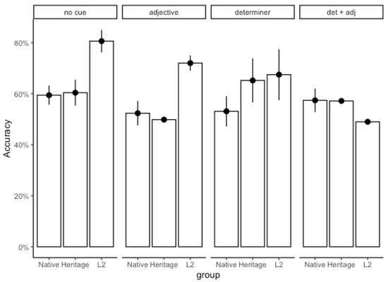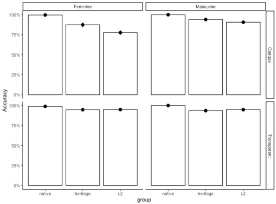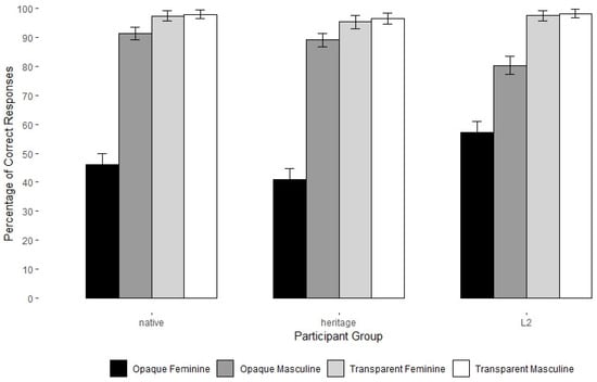 The participants had five seconds to verbalize a complete NP minimally containing the correct definite determiner, the noun, and the correct adjective form (i.e., el libro (es) blanco “the book is white”). There were 24 nouns (boca “mouth”, leche “milk”, mercado “market”, etc.), 4 in each of six categories (2 genders and 3 endings, transparent (–a or –o), –e, –consonant). The instructions and the training examples made it clear that sometimes the form of the adjective had to be changed to agree in gender with the noun. A series of one-way ANOVAs confirmed that these nouns were normed by gender and transparency on frequency, length in letters, and length in syllables.5 All adjectives were transparent (e.g., raro/a “rare”, largo/a “long”, famoso/a “famous”, etc.). (See https://osf.io/j6p5b/?view_only=9794107ee2884da99aaf8623d76537ca, accessed on 11 January 2024). An anonymous reviewer questioned the fact that in this task the adjectives appear in two different forms, sometimes matching and sometimes mismatching the noun in gender, and suggested that the task used by Montrul et al. (2008), in which participants themselves provided the adjective, would have been a better methodology. We chose this task format, following Bates et al. (1996), Guillelmon and Grosjean (2001), and Montrul et al. (2014), because it was important to maximize the probability of the participants producing full NPs with adjectives, since in the Montrul et al. (2008) study 22.7% of the native speakers, 36.24% of the heritage speakers, and 41.67% of the L2 learners did not produce adjectives. Presenting all adjectives in masculine form in the current task would lead to overextensions of masculine agreement to feminine nouns, whereas presenting adjectives in gender-matching form with the target noun on every trial would be giving away the response, especially to the L2 learners whose gender accuracy we were assessing. Therefore, to avoid biasing responses toward either gender, half of the items in each category appeared with a gender-matching adjective and half appeared with an adjective in the opposite gender (mis-matching adjective). The consequence of this choice is that the learners would have to override the non-matching presentation in half of the items to produce correct agreement. We acknowledge that failure by the participants to override the gender of the mismatching adjectives would inflate the rate of gender assignment errors, and we consider this fact in our analyses.