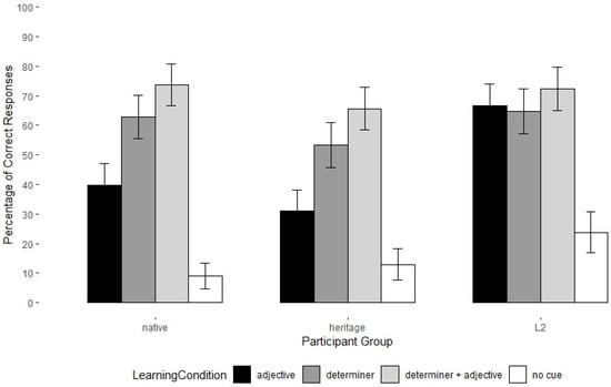 To conclude, using nonce nouns is a good way to gain new information on the classification of nouns at the very initial stages of learning. We found differences in how learners with different types of language learning experience learn the gender of nouns in Spanish. Heritage speakers are like native speakers in how they process input for learning gender in Spanish, while L2 learners show different patterns. Heritage speakers and native speakers pay attention to all informative cues whereas L2 learners rely more on adjectives, even when these may be used inconsistently in the experiment.
