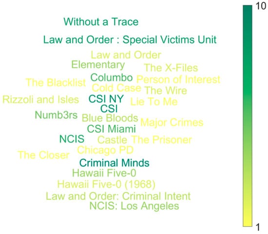 The titles of the 28 TV shows with colors representing the number of episodes from each series in the dataset are shown in Figure 1.