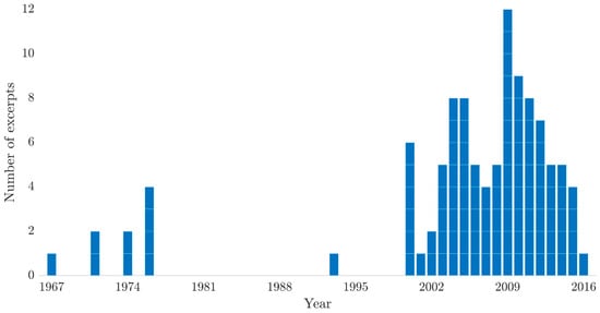 Figure 2 shows the distribution of excerpts according to year. Most of them were produced during the CSI era; the last excerpt in the dataset first aired in 2016. The earliest scene was from an episode of The Prisoner from 1967: S01E10T21:57. In our notation, “S” introduces the season, “E”, the episode, and “T” is followed by the time stamp corresponding to the beginning of the excerpt. Excerpt duration ranges from 15 s to 3 min and 15 s, with a mean of 59 and a standard deviation of 29 s for a total duration of 1 h and 45 min.