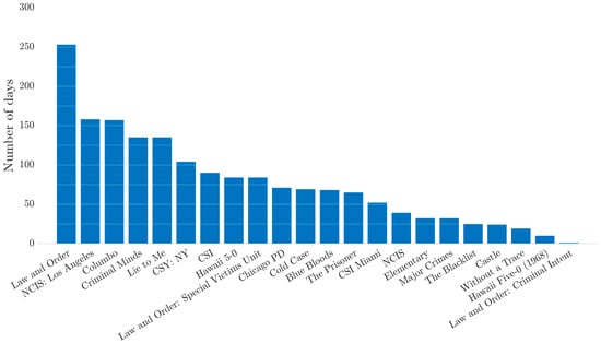 The claim that the TV shows we chose to study are omnipresent on French TV is substantiated by Figure 3. The graph shows the number of days when at least one episode of our series was broadcast on French TV between 1 January 2022 and 4 December 2023 (704 days). We wrote a MATLAB script to search a website that stores TV listings2.