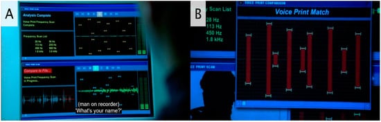 Additionally, there are three excerpts where the term “voiceprint” (with various spellings) is displayed on software graphical user interfaces; two of them are shown in Figure 5. Incidentally, the two screenshots bear a close resemblance to one another because they come from episodes of the same show that came out one year apart. In addition, the superposition of key acoustic cues is arguably reminiscent of a DNA electropherogram. Therefore, although DNA is never mentioned explicitly as an analogy, it is evoked through visual displays.