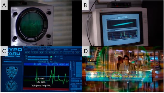 Various types of signal visualizations. (A) An oscillogram from Hawaii Five-0 (1968) S08E23T18:26. (B) Oscilloscope and spectrogram from The X-Files S01E07T17:38. (C) A waveform from Law and Order: Special Victims Unit S07E15T03:34. (D) Waveforms from CSI: Miami S10E08T28:51.