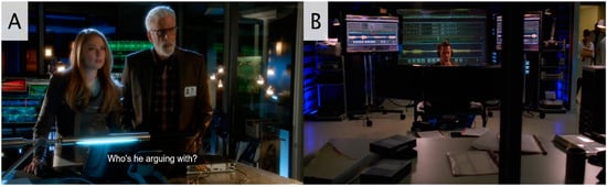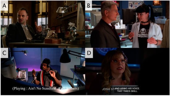 While technical terminology is linked to the sanctuary (a dark room illuminated by artificial light sources), the signal analysis expert is often no ordinary individual. A lonely IT genius navigating a parallel digital world of lavish sartorial opulence or Gothic fashion style, a gifted musician who “hears in perfect pitch” (CSI S01E08T17:20), characters with technical expertise handle seemingly incomprehensible waveforms, akin to gurus conveying an enigmatic message. Figure 9 shows a sample of forensic analysts who have eccentric behaviors or outfits. In panel A, Sherlock Holmes, who performs voice analysis himself here, is a recovering drug addict. In panel B, Forensic Scientist Abby Sciuto mixes gothic fashion with a formal lab coat. In C, the forensic specialist is a cliché Black American gifted musician with the stereotypical dress code, language, and tendency to flirt; his name says it all: Disco Placid. And in D, Penelope Garcia is yet another nonconformist analyst who, besides being famous for her colorful clothes and eccentric behavior, is a former hacker who was caught by the FBI and given the choice to either spend the rest of her life in prison or work for them.