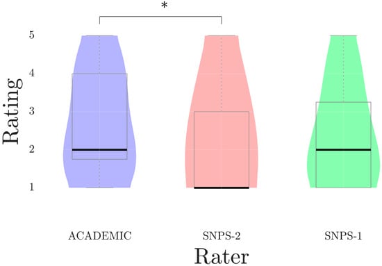 Plausibility ratings for each rater; *: statistically significant at the p < 0.05 level.