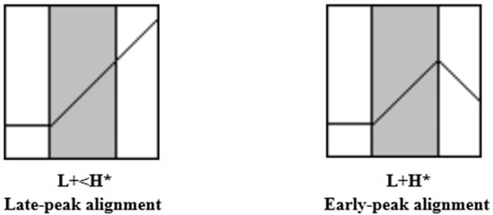 Previous works on the PAS variety spoken in Pucallpa have only attested two pitch accents in terms of F0 peak alignment in broad focus declaratives: late peak alignment and early peak alignment (García 2011). In Figure 1, I provide schematic representations of these two bitonal pitch accents following Aguilar et al. (2009). In these images, the gray areas represent the stressed syllables.