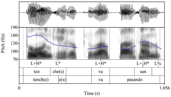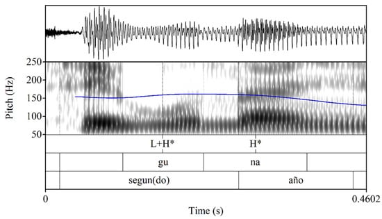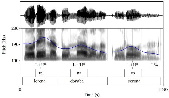 Figure 2 shows the intonational contour of a PAS broad focus declarative Lorena donaba la corona, as collected in a reading task by García (2016). Like all images in the present study, content words and stressed syllables are segmentally marked. In the upper tier, I include the tonal representations of pitch accents and edge tones following Sp_ToBI conventions. Notice that all three pitch accents are noticeable, and they all show an early peak alignment: L+H*. Furthermore, the high tone in the pitch accent of the word “donaba” exhibits a downstep movement and is shown here with the exclamation mark (!) before the H. The boundary tone of this utterance is L%.