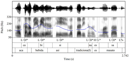 Intonational contour of a PAS utterance. Acá la bebida así tradicional es masato (‘Here the traditional drink is Masato’).