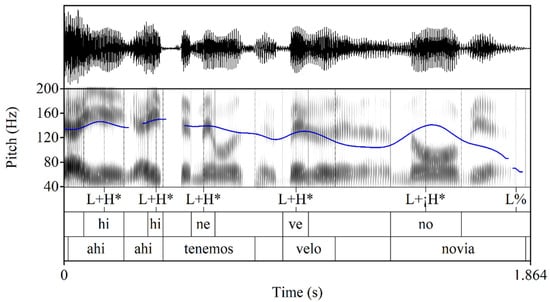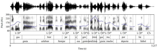 Intonational contour of a PAS utterance. Le gusta celebrar, festejar a esa gente… También le gusta mucho el deporte, el fútbol (‘Those people like to celebrate, to party… They also like sports very much, soccer’).
