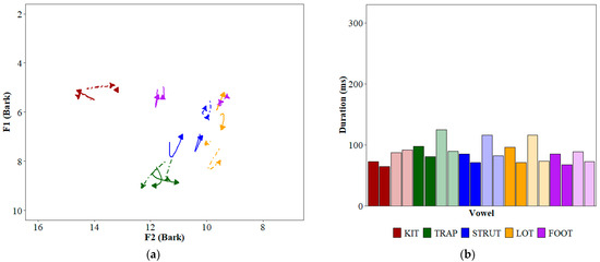 - Ferragne, Emmanuel, and François Pellegrino. 2010. Formant frequencies of vowels in 13 accents of the British Isles. Journal of the International Phonetic Association 40: 1–34. [Google Scholar] [CrossRef]