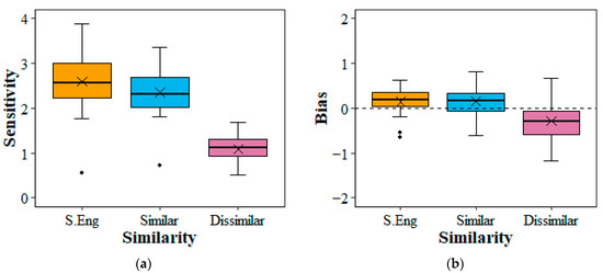 Boxplots of L2 learners’ sensitivity (a) and bias (b) scores in the three similarity conditions. Lower and upper box edges correspond to the first and third quartiles. Whiskers extend to the most extreme datapoints, 1.5 times the interquartile range, and the black circles represent datapoints beyond the whiskers. The horizontal line and cross within a box depict the median and mean values.