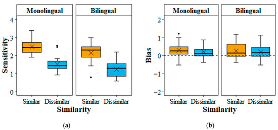 Boxplots of monolinguals and bilinguals’ sensitivity (a) and bias (b) scores in the two similarity conditions. Lower and upper box edges correspond to the first and third quartiles. Whiskers extend to the most extreme datapoints, 1.5 times the interquartile range, and the black circles represent datapoints beyond the whiskers. The horizontal line and cross within a box depict median and mean values.
