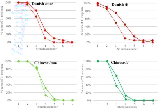 Within-group comparisons were also made to compare the curves corresponding to the four continua. Only the Chinese group was confirmed to have a similar slope (p = 0.15), but both learner groups were confirmed to have significantly different slope (p < 0.01). The comparisons of long vs. short syllables for /ma/ and /i/, respectively, also yielded significant differences at the level of p < 0.01 for both learner groups.