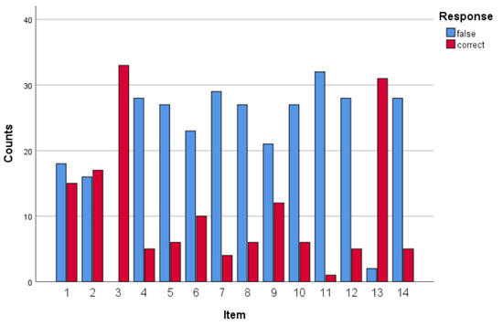 Figure 1. Absolute counts for correct and false answers by item (1 to 14).