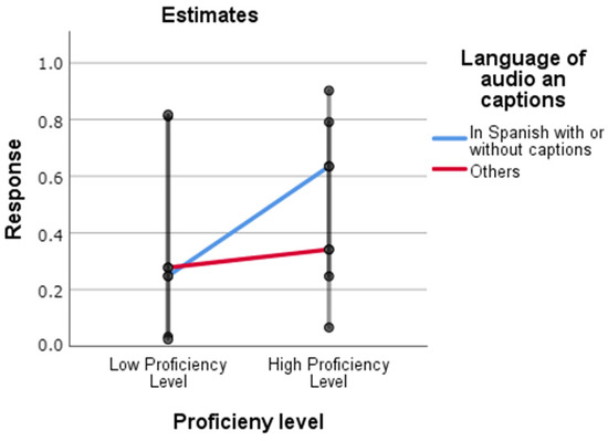 Figure 2. Estimated marginal means of responses (0 false; 1 correct) by language of audio and captions and proficiency level (high vs. low).