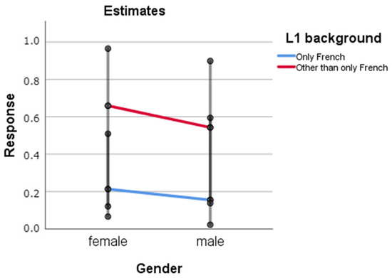We also investigated whether individual factors, such as gender and L1 background, influenced the performance of the students (Hypothesis 3). The results indicate that gender had only a minimal effect, as female students exhibited a higher proportion of correct responses (EMM = 0.420, SE = 0.208) compared to male students (EMM = 0.318, SE = 0.192). Consequently, this difference was found to be statistically nonsignificant (F(1, 305) = 0.708, p = 0.401). Regarding the students’ L1 background, learners who had L1 languages other than only French (Spanish n = 1, Polish n = 2, and Romanian n = 1) were associated with a higher proportion of correct responses (EMM = 0.602, SE = 0.227) compared to those who had only French as L1 (EMM = 0.182, SE = 0.110). The binary logistic regression revealed a significant fixed effect of L1 background on the outcome variable (F(1, 305) = 5.946, p = 0.015). If we look into the interaction effects between both individual factors, we can observe a similar effect of the L1 background both in male and female students (see Figure 3). No significant fixed effect was found for this interaction (F(1, 305) = 0.003, p = 0.957).